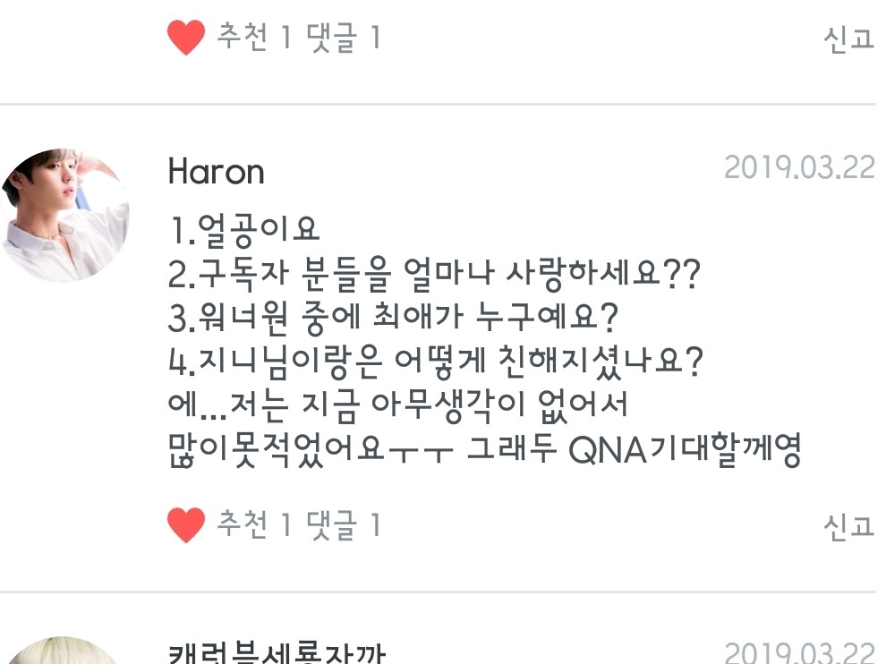 1.얼공♥ 알구이써염! 2. 하늘만큼 땅만큼 지구만큼 우주만큼 사랑하죵! 3.박우진 개좋아요ㅠㅠ 4.지니랑여?? 엄마들끼리 저희 태어난 병원에서 친해지셔서 저 태어난 1일 후에 지니 태어나가지고 지금 13년차 칭구임댜!