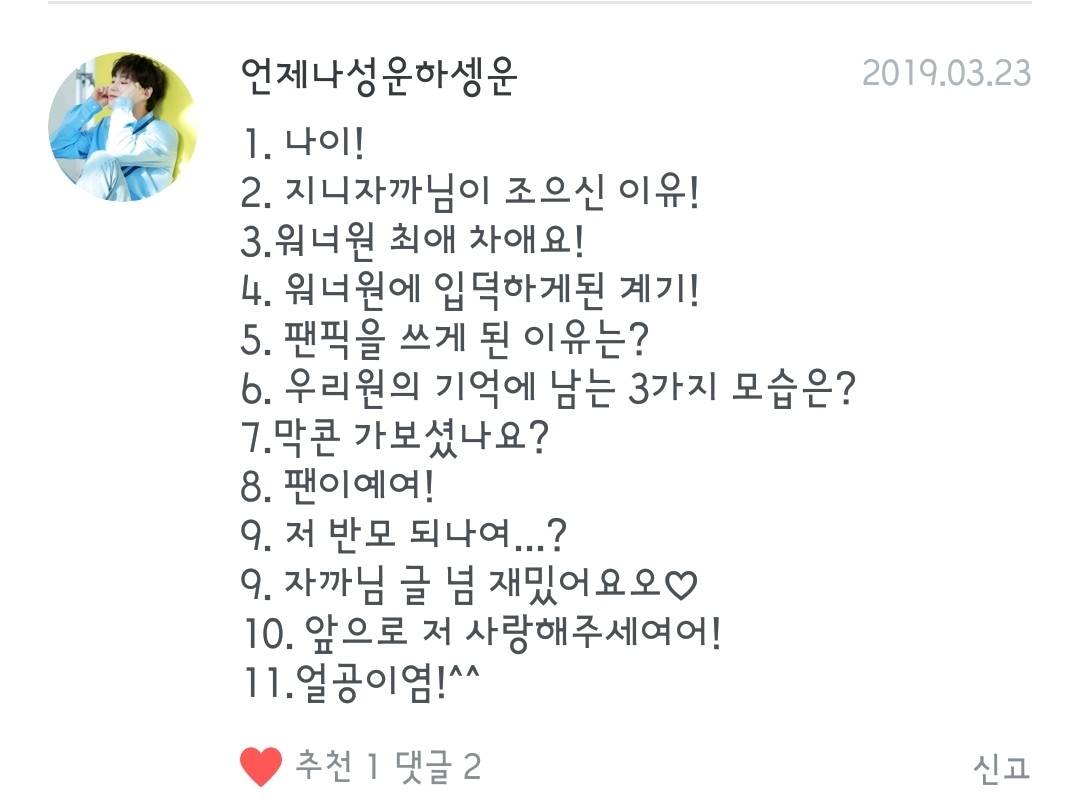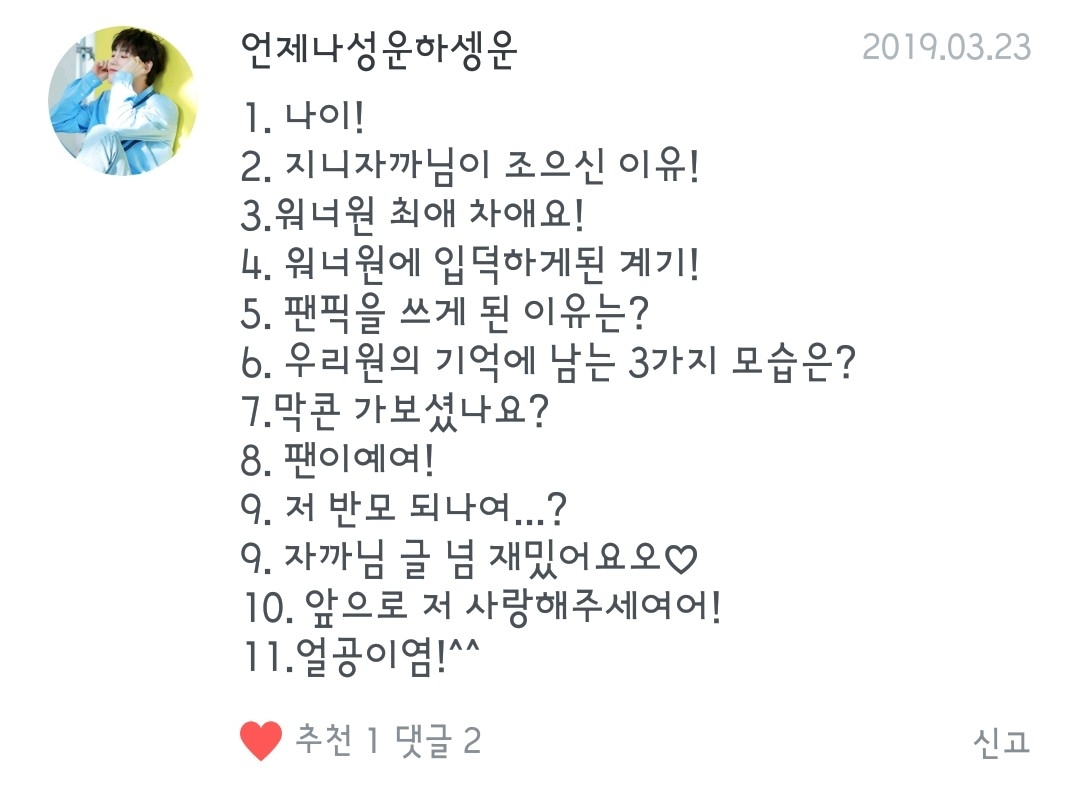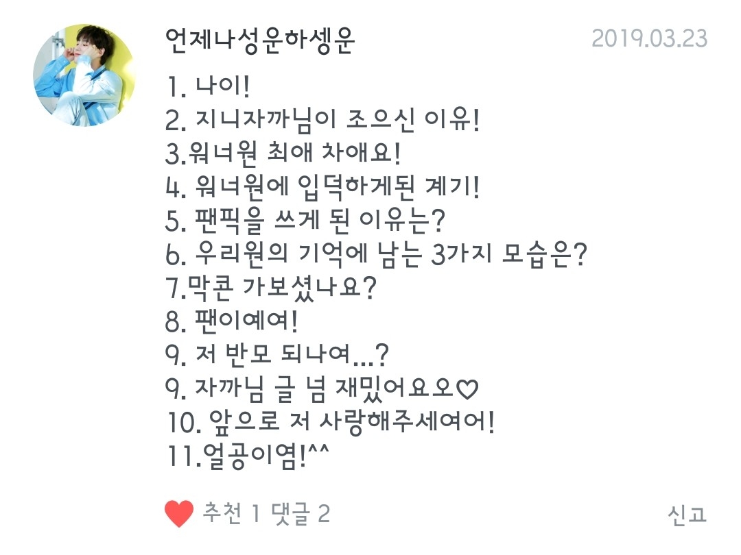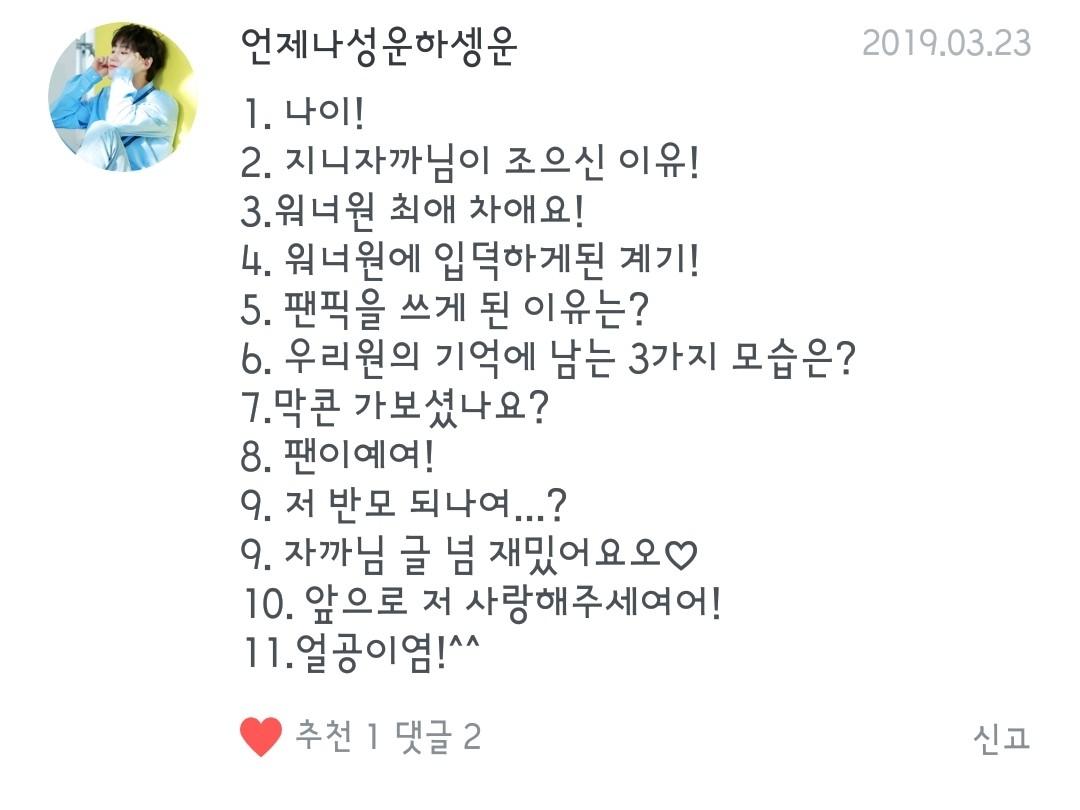 3.최애:우지니 차애:지후니!! 4.친구가 워너원 노랠 들려줬는데 목소리가 개꿀이더라고요ㅠㅠ 5.지니랑 밤을 새려구 했는데 그때 생각난게 팬픽이여서 무작정 쓰기 시작했습니다!