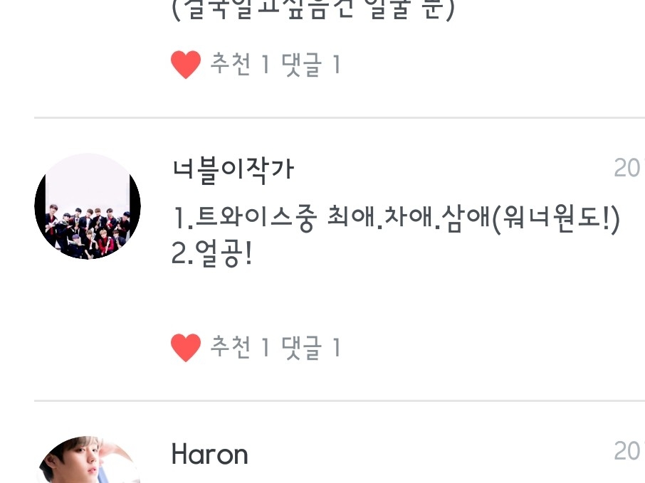 1.트와이스: 최애는 사나언냐! 차애는 채영언냐! 삼애는 다현언냐!! 2.워너원: 최애는 박우진! 차애는 박지훈! 삼애는 이대휘, 강다녜리!! ②얼공! 좀만 기달렴! 마지막에 나올끄얌