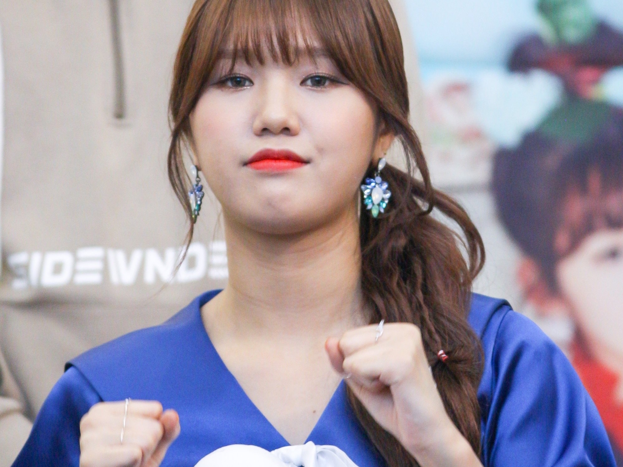 슈화는 놀란듯 급하게 자신의 얼굴을 손으로 가리며 정국의 뒤로 숨어버렸다.