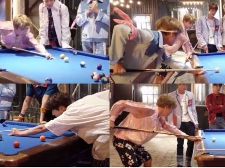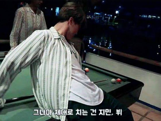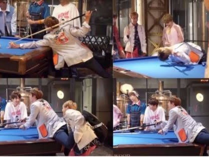 I bumped Taehyung's knees and signaled him to drop a certain card.