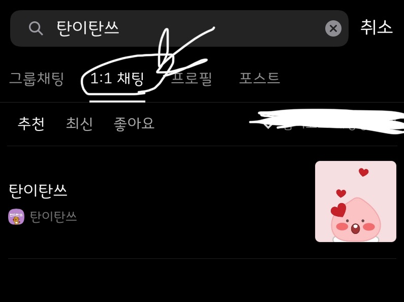 “저렇게 치시면 나온답니당~ㅎㅎ 아 그리구 1:1채팅으로 누르셔야 나옵니당~”