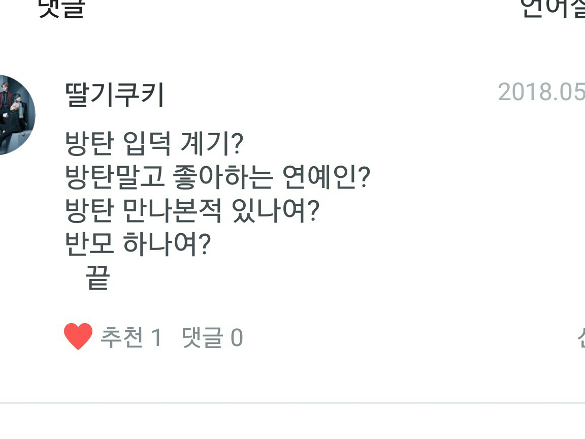 방탄은 제가 우연히 유튜브를 보다가 멋있는 사람이 7명이 있어서 좋아했고여. 전 레드벨벳도 좋아합니다 실제로 본적은 없습니다 전 언제나 반모 적극 환영 입니다