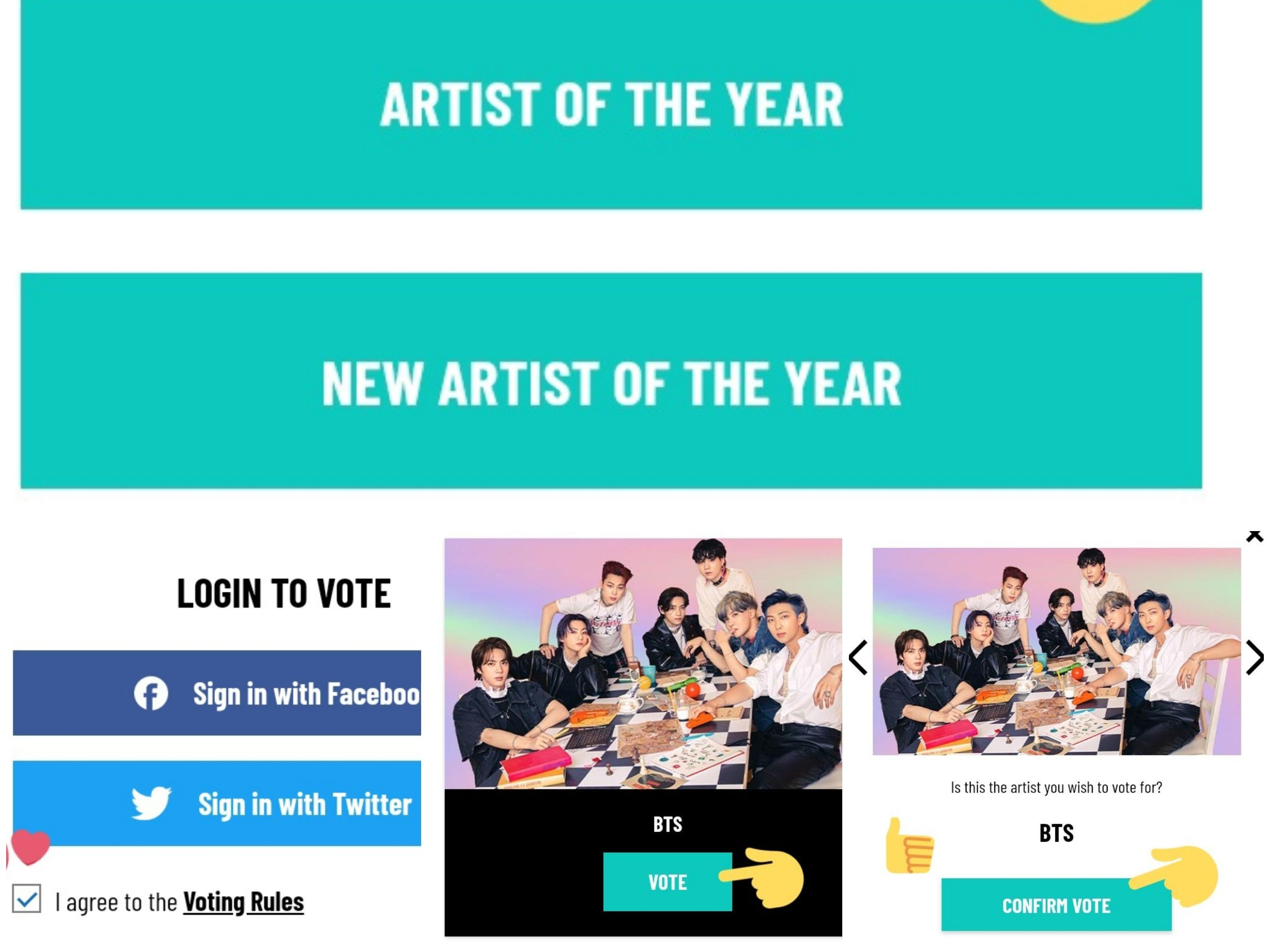 페이스북이나 트위터로 로그인하고, 이용 약관에 동의한 후, 카테고리에서 원하는 소년들을 검색하고, 투표하고 투표를 확정하면 됩니다. 하루에 계정당 한 표만 투표할 수 있습니다.