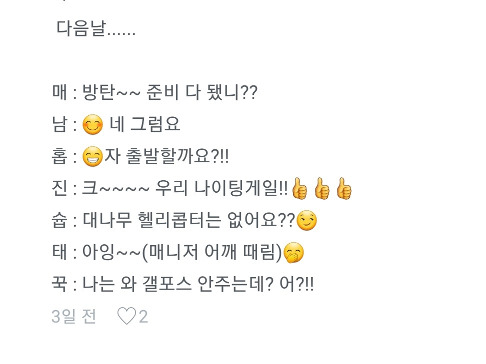 그렇다. 내가 굳이 여기서 일하는 이유는 남준이와 함께 진행해야 하는 일이기에 숙소에 자리를 잡았는데...... 막내들이 신이난 목소리로 밖으로 나왔다