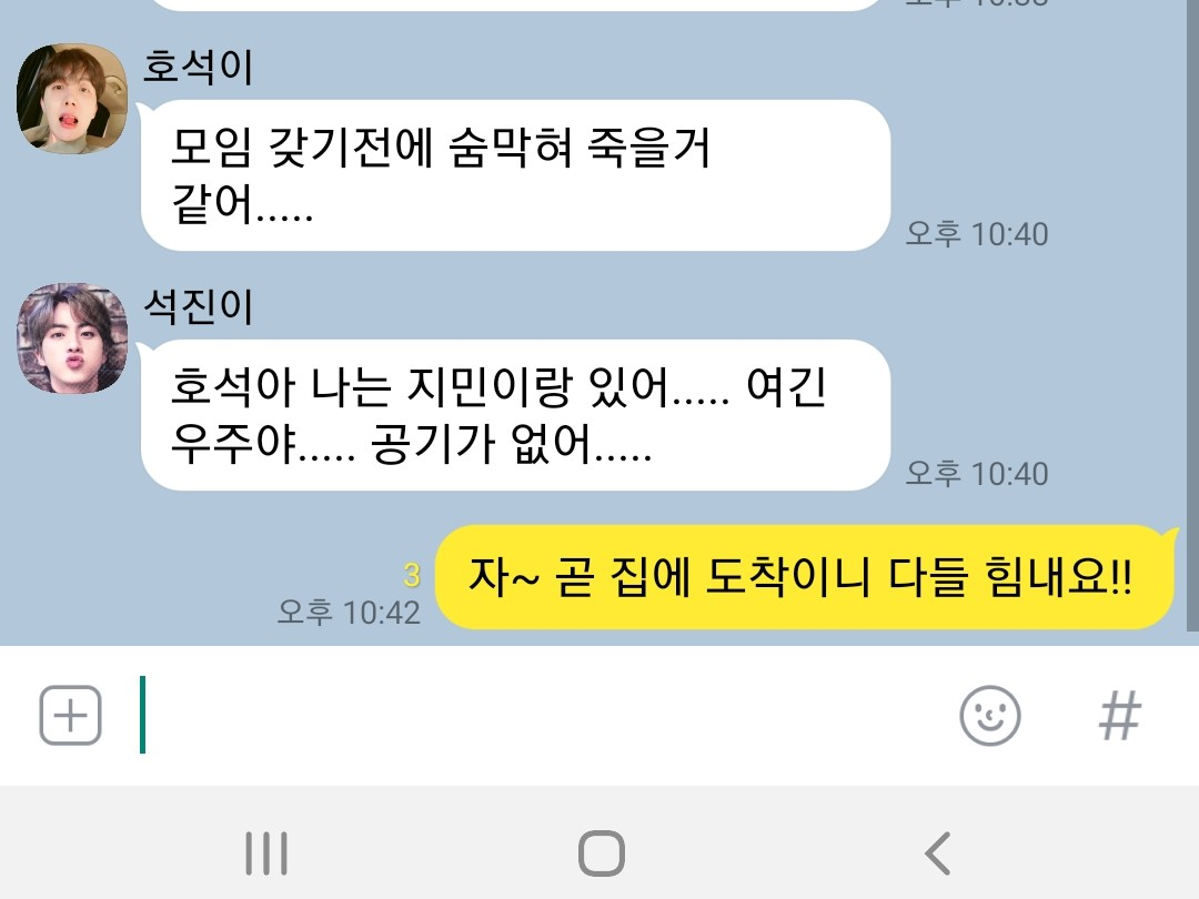 아 들었어?? 디게 웃기지? 지민이 너랑 더 붙어있었는데 그건 못보고~ㅋㅋㅋㅋ 너무 신경쓰지마~ 곧 조용해 지겠지 ㅎㅎㅎ 내가 가서 커피 사올께~ 아아??