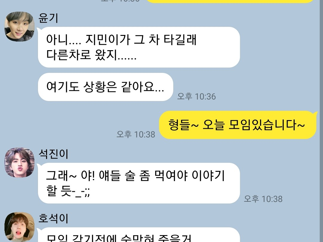 태형이와 정국이도 말이 없어 남준 윤기 석진 호석이도 무슨일인지 감이오질 않았다 호석이가 태형이에게 무슨일인지 물어봤지만 아무일도 아니라며 애써 웃었다