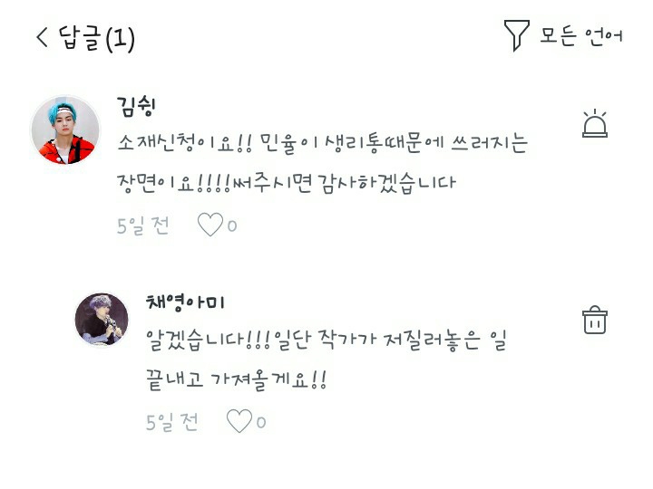 '김슁'님이 적어주신 소재입니다!!적어주신 소재들은 다 제 메모장 안에 있어요~일단 작가가 벌여놓은 일이 마무리 되면 가지고 오겠습니다!!