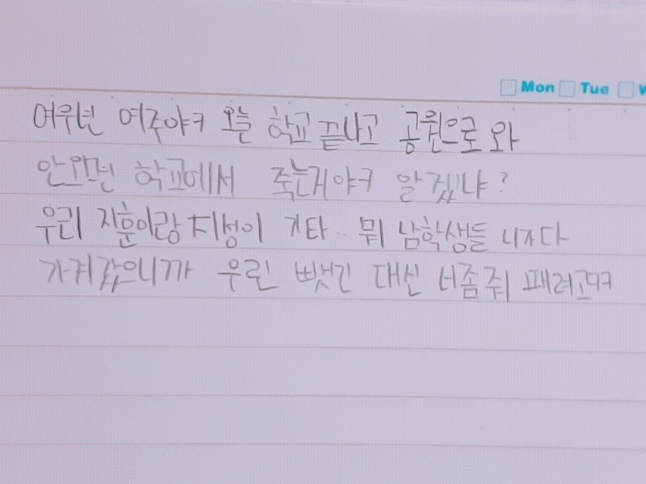 여우년 여주야ㅋㅋ 오늘 학교 끝나고 공원으로와 안오면 학교에서 죽는거야ㅋㅋ알겠냐? 우리 지훈이랑 지성이 기타. 뭐 남학생들 니가 다 가져갔으니까 우린 뺏긴 대신 너좀 패자ㅋㅋ