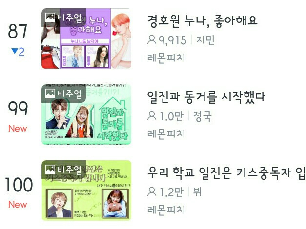 아침에 일어나서 보니까 베스트 87위,99위,100위에 저희 작이 있더라구요ㅠㅜ
