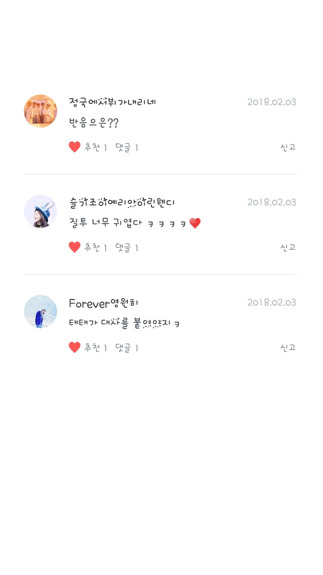 forever영원히님, 슬기조이예리아이린웬디님, 정국에서뷔가내리네님