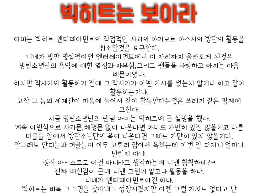 지금 이런 개같은 사태때문에 많은 아미분들이 탈덕을 하고 계시는데여 탈덕하고 팔로우 취소하고 이런거 다 방시혁 피디님 께서 원하는 일들이니 이런 사태일수록 우리 아미들이 똘똘 뭉쳐야됩니다
