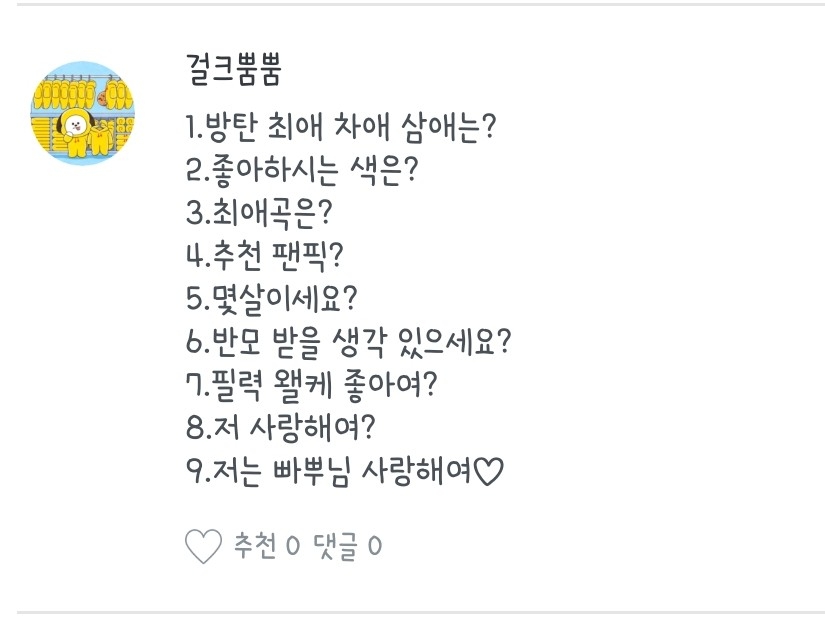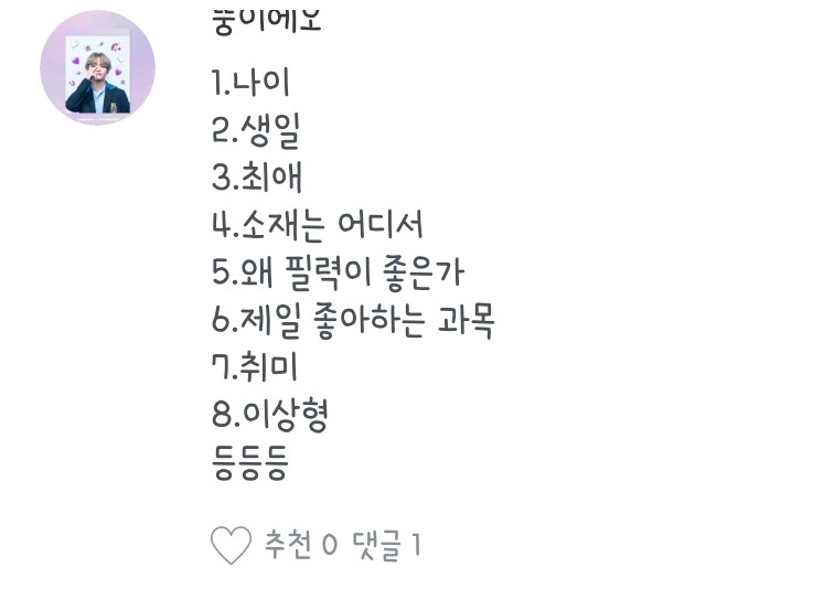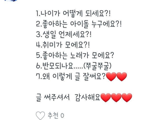 1.음..네! / 2.박지민 김석진 김남준! / 3.아뇨! / 4.어..실명되고 싶으시다면? / 5.노래 듣다가 나오거나 아니면 관심사에서 나와용 / 6.2019년도 기준 14살입니다 / 7.아이즈원 좋아합니다 (쪼율 최고..)