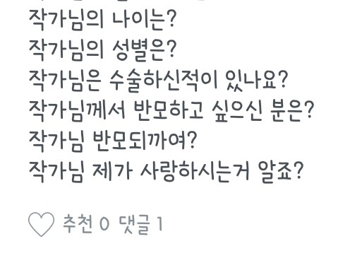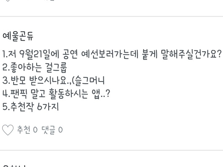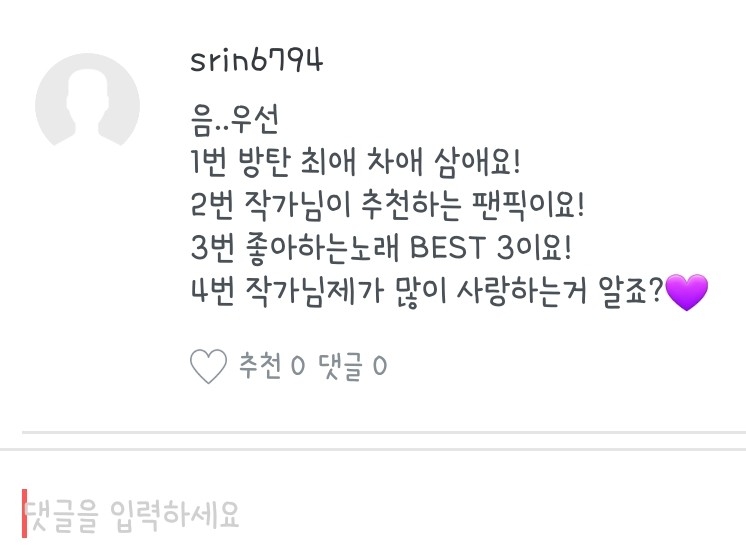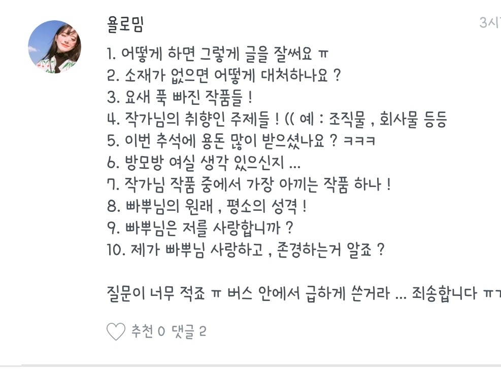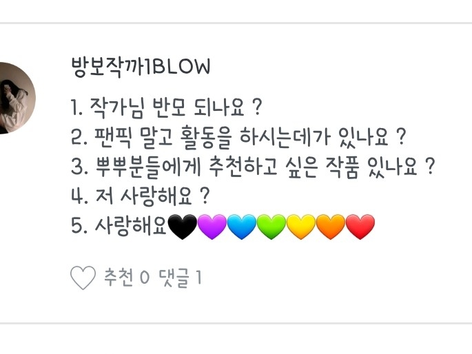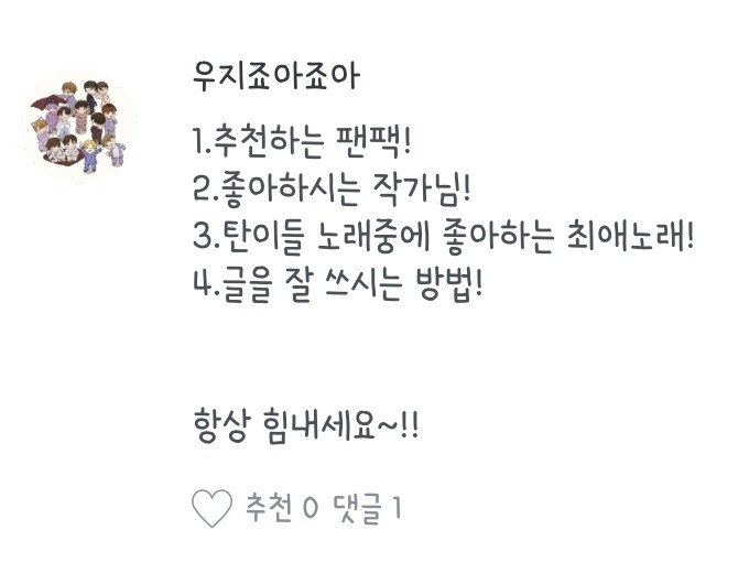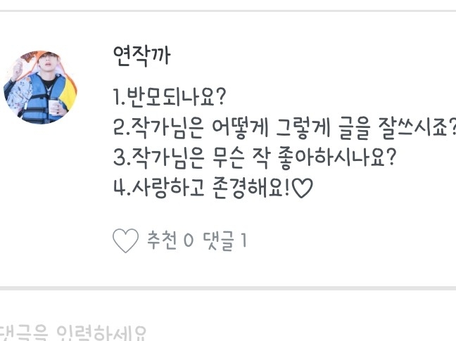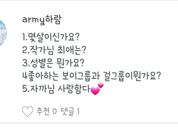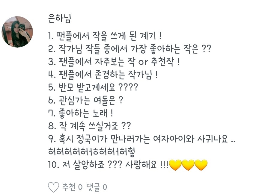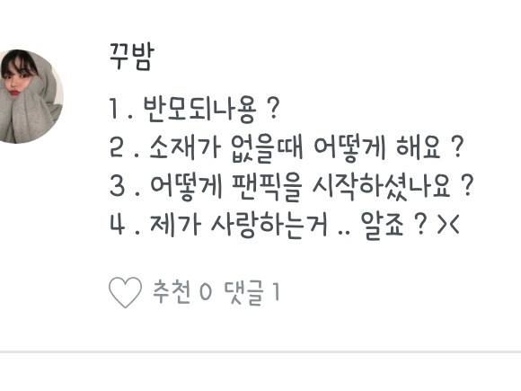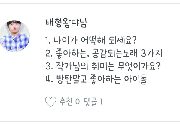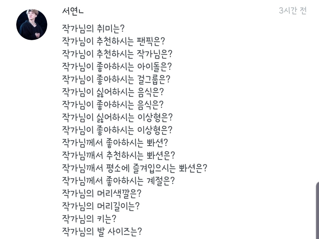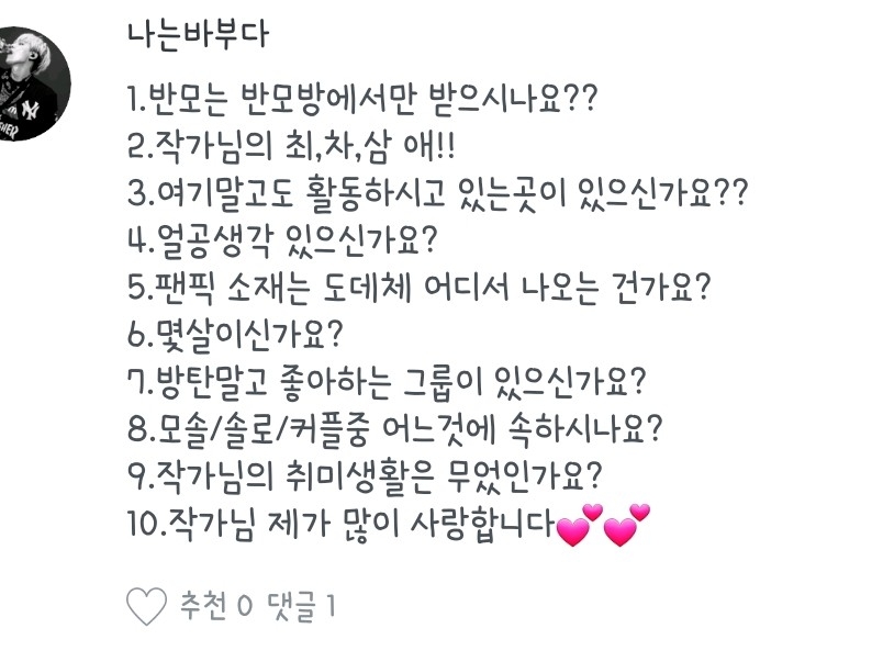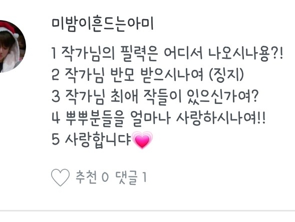 좋아하는 노래, 작가분, 팬픽 뭐..그런 질문들은 질문마다 다를 수도 있으니 참고 부탁드려용:) 하나하나 읽어보시는 거에 추천드립니당😄