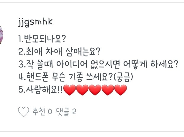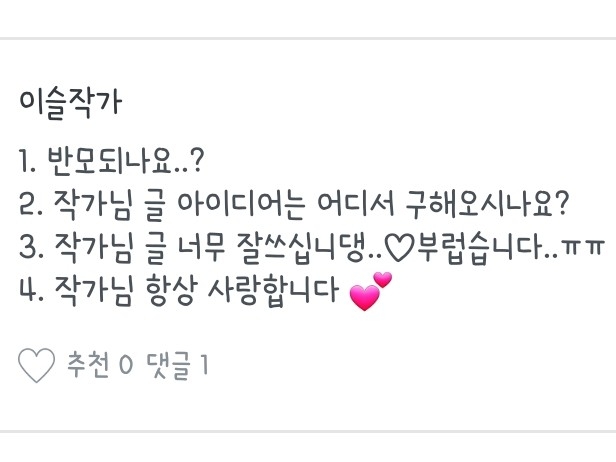 1.원래는 사진 다운 받다가 평소에 글 쓰는 거를 좋아하기도 해서! / 2.반모방 따로 열어용 / 3.사랑해용❤