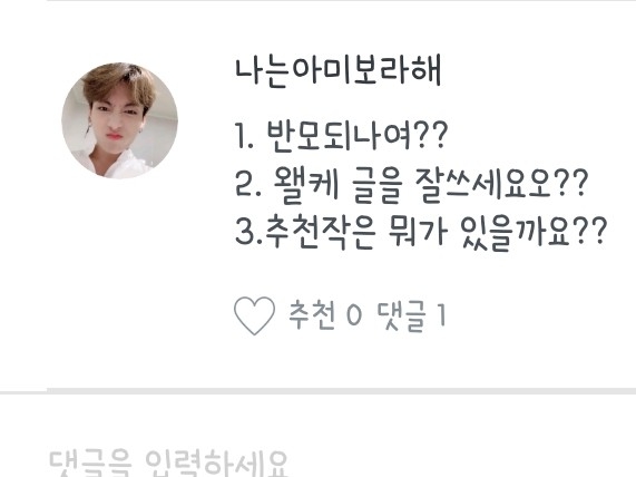 1.아미 초기 때 관련 앱 찾다가 / 2.일진이 저 꼬시는데요? (첫작이라서) / 3.자주 보는건 반모자들거! 추천..노력파 1등 김여주×뒤에서 1등 김태형, "다치지마 민윤기" / 4.음..방보탄라님! / 5.반모방 조만간 열 예정이에용