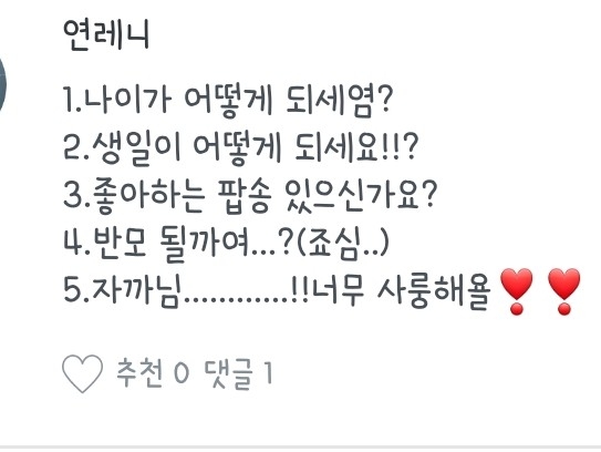 1.19년도 기준 14입니당 / 2.7월 7일입니당 / 3.저 팝송 많이 듣는데..요즘은 If I can't have you(shawn mendes) 지쨔..👍🏻 / 4.반모방 따로 열개용 / 5.저두용❤