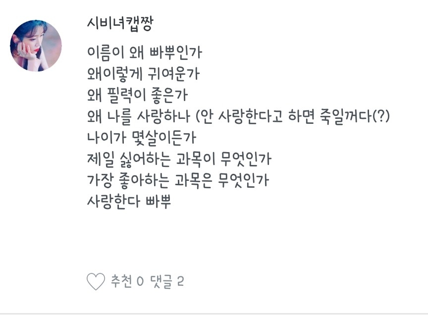 1.2019년도 기준 14입니당 / 2.7월 7일! / 3. 박지민, 조유리 / 4.어..취미생활하다 제 머릿속에서..? / 5.안 좋아봐서 모릅니당 / 6.영어? 체육? / 7.스트리머 방송보는 거 /8.귀여운데 반전매력있는 사람 /9. 등등등