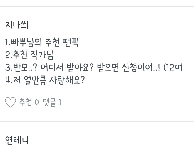 1.따로 열게용 / 2.못 씁니당 / 3.반모자들 작 좋아해요❤ ("다치지마 민윤기",노력파 1등 김여주×뒤에서 1등 김태형 등) / 4.고마워요😊