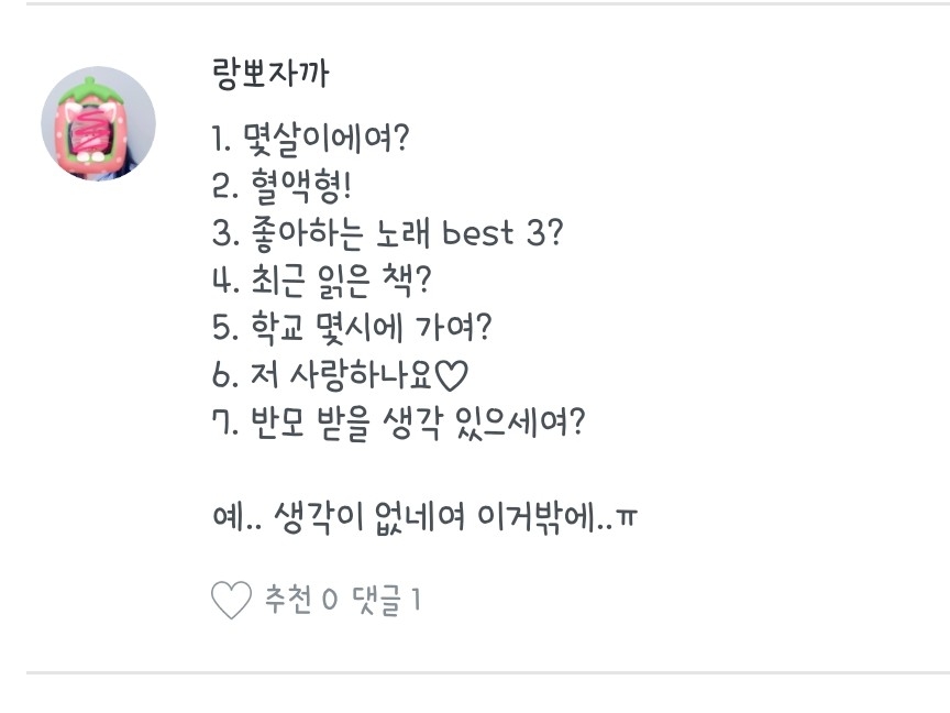 17.2019년도 기준 14살! / 18.여자 / 19.편도수술 한 적 있어용 / 20.음..방보탄라님? / 21.반모방 따로 열게용 / 22.헤헤 네엥
