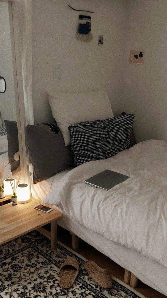 _앉은 채 침대 쿠션에 기댄 여주는 눈을 지그시 감는다.