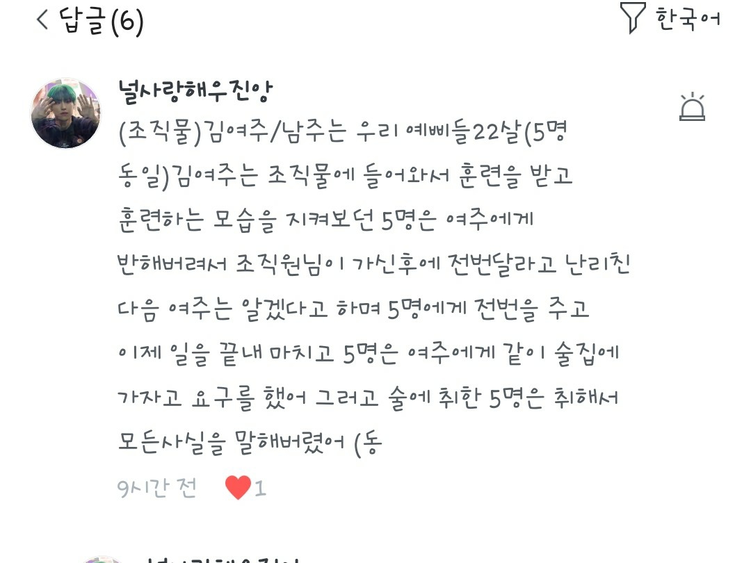 술에 취한 5명은 여주와 같이 술을 마시러 왔다는걸 잊어버리고 지들끼리 애기를 시작한다