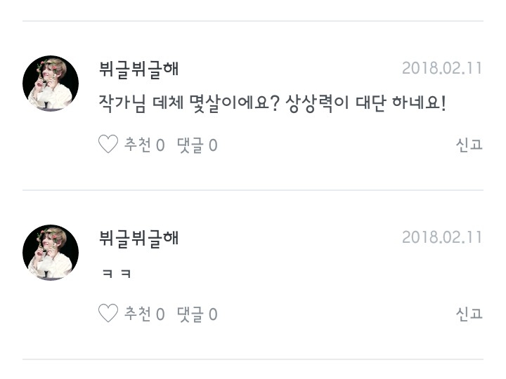 제 나이는 아까 말씀 드렸듯이 중학생입니다-! 제 상상력이요? 아.. 이 팬픽의 아이디어는 '늉기야사랑해' 라는 제 친구가 냈는데요- 이 친구는 완결한 '인기남 전정국' 과 연재중인 '연습생 임예림' 의 작가입니다-! 저는 글을 못써요 :)