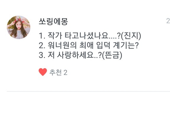이번에 Q&A 질문 많이 해주셔서 진짜 레알 헐 감사드립니다! 1000명 감사드리고 앞으로도 더 성장한 워너블인 작가 예쁜하늘구름이 되도록 하겠습니다!