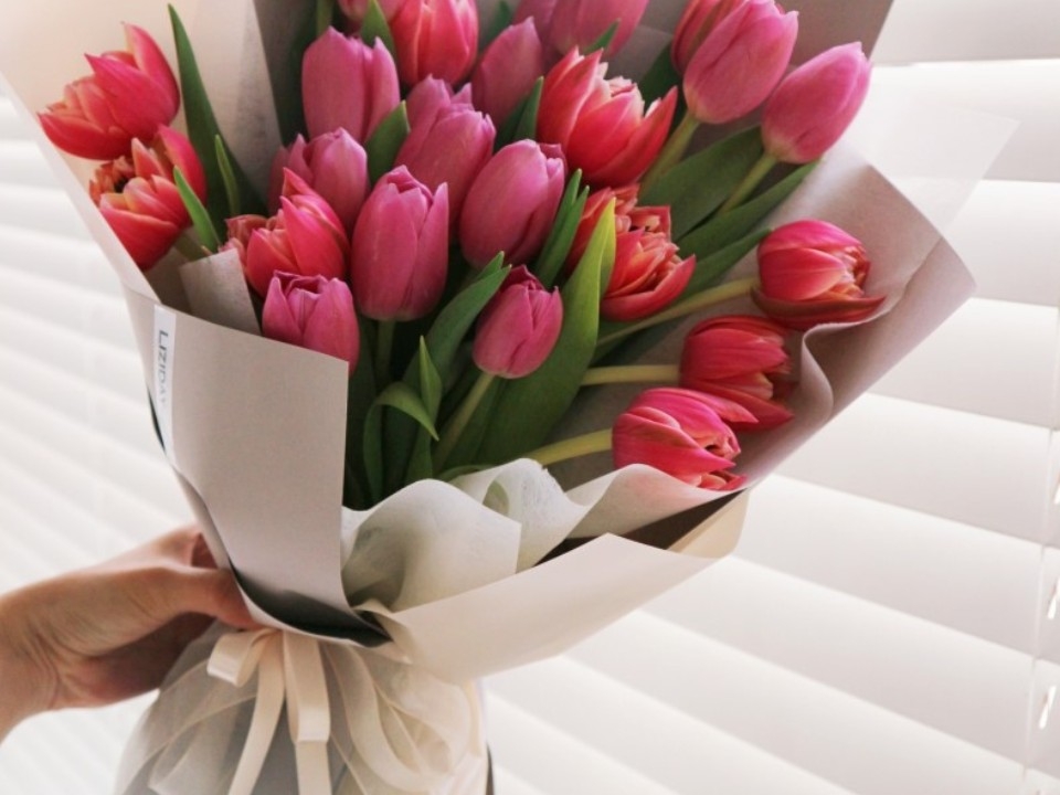 내가 준비한 선물 중 하나는 튤립이 예쁘게 장식된 꽃다발.