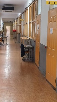 000과 재환은 한참을 걸어 교실 복도에 도착한다.