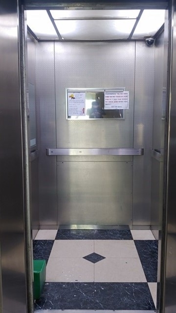 엘리베이터 공간에 있는 둘 어색하다.