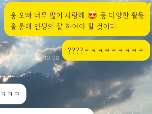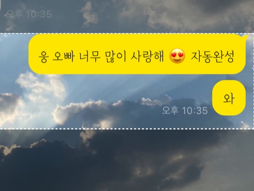 제가 장난으로 자동완성으로 아무거나 쳤는데 ‘웅 오빠 너무 많이 사랑해😘’ 이렇게 뜨는거에요ㅠㅋㅋㅋㅋㅋㅋ 요즘 웅오빠를 많이 말해서 그런가?(MY 최애는 대휘오빠)