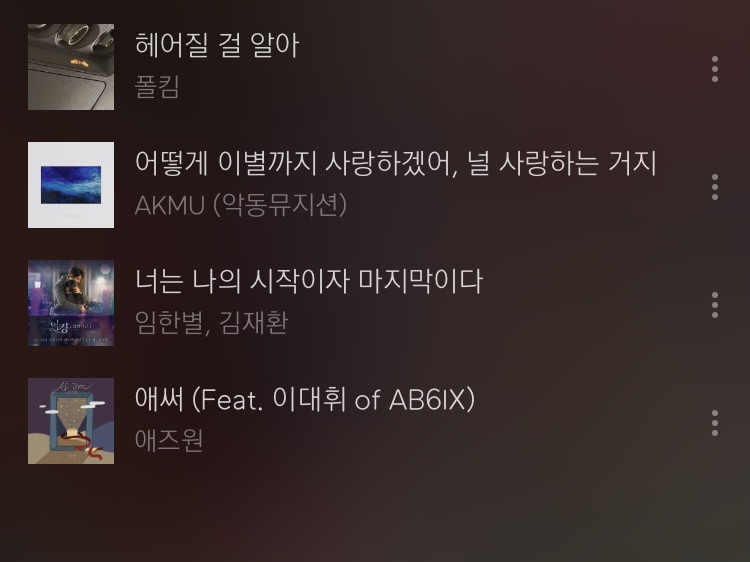 너는 나의 시작이자 마지막 이다는 고음이 아주...미쳤어요 그리고 악동뮤지션! 유명해서 다들 아실거에요 너무 좋은 거 아시죠!! 애써는 가사가 좋고 휘오빠가 작사,작곡 해서 추천했어요 이 노래 듣고 울었어요ㅠㅠ
