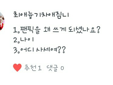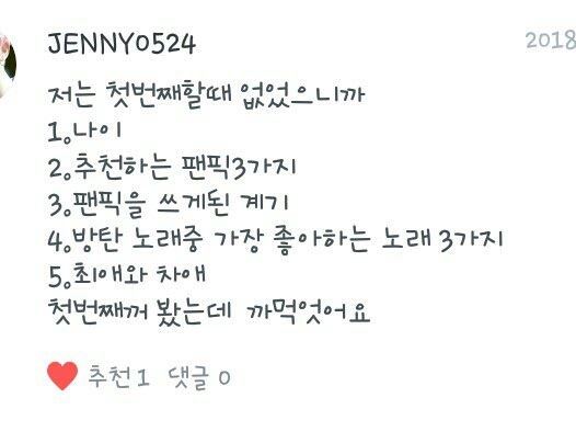 나이는 13살이구여 추천팬픽은 우정일까?,보여줄께 더 예뻐진 나 였나?,또...방탄어린이집 계기는요 집문을 여는데 갑자기 생각나서 쓰게되었어여 1위는 봄날이고 2위는 DNA 3위쩔어 최애=정구기 차애=지미니 입니다