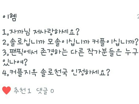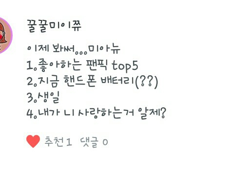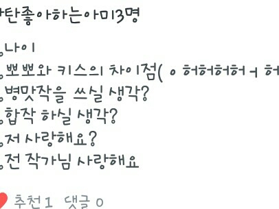 13살이구요 엄//방타니들이 한말 혀의 유무~합작은 나중에 기회가 온다면 해보려구요 병맛작은 제가 그런거 잘못쓰거둥요 당연히 사랑하죠~♡♡