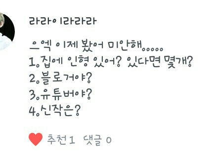 인형 있는데 한 5개~6개 정도일거예요 블로거는 아니예여 엄 예전에 했는데 지금은 안해요 신작은 (나만의 페레이드),(진짜여친 가짜여친),또...(정국이 여친 뺏기 프로젝트)