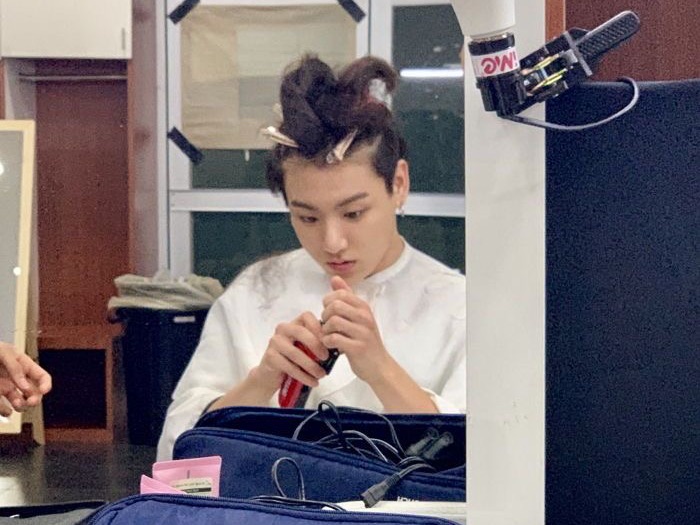 기다리는 시간동안 벽에 기댄채 핸드폰에 저장해 둔, 정국이 보내준 엽기사진을 보며 시간을 보내고 있을 때.