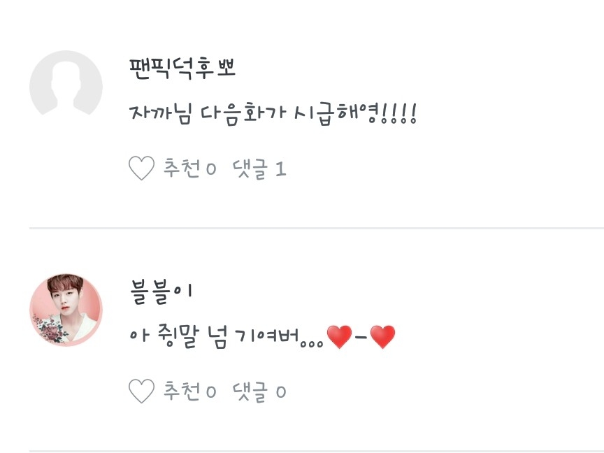 댓글은 별로 없었지만 그것이 저에게는 작은 희망이 되서 팬픽을 쓰게할수 있었습니다.그리고 댓글을 달지 않으셨더라도 하찮은 이 팬픽을 봐주신 분들도 제 어두운 마음속 한줄기 빛이였는데
