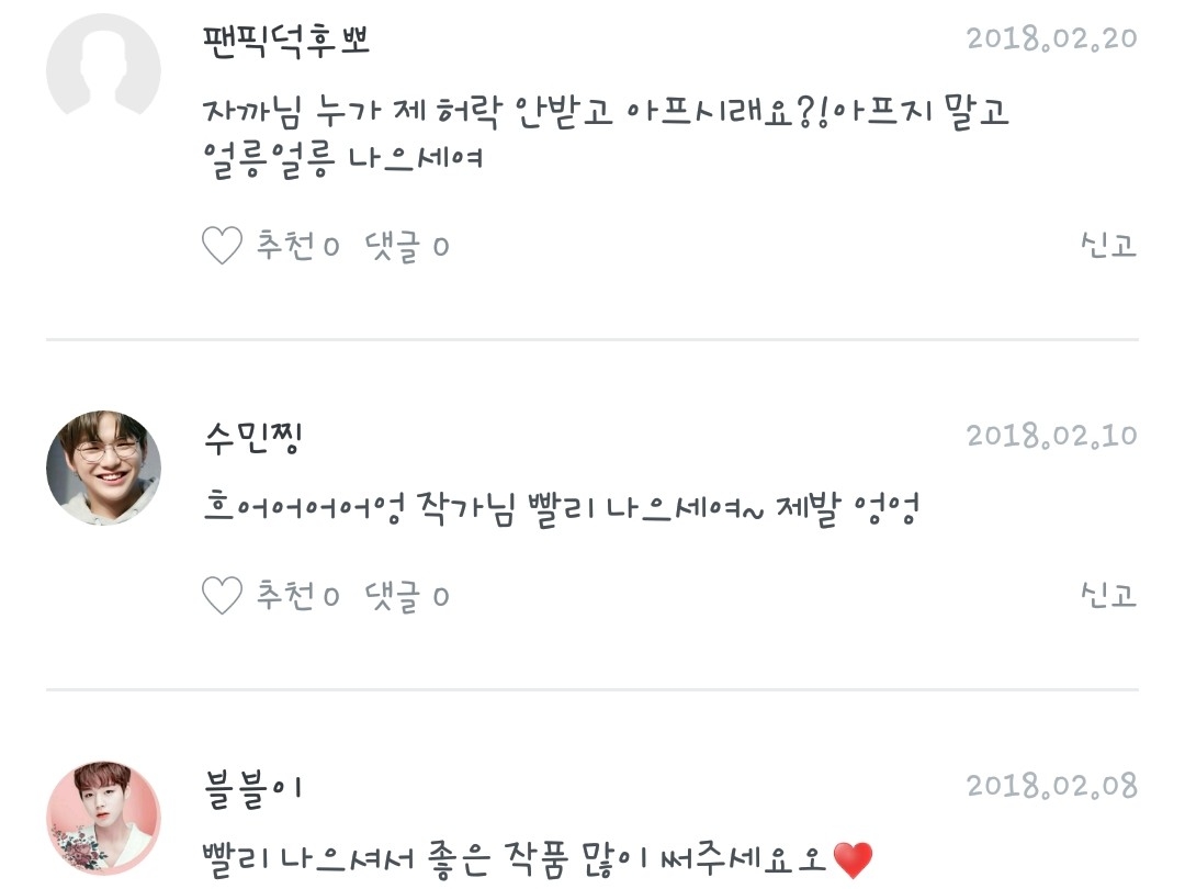 댓글도 별로 없고 글 소재가 기억이 안나고 제가 아는 최모씨 때문에 옛남친 생각이 나서 마음이 안좋네요..진짜 완결하고 싶지는 않았는데..이게 제가 처음 쓴 팬픽인데 ..