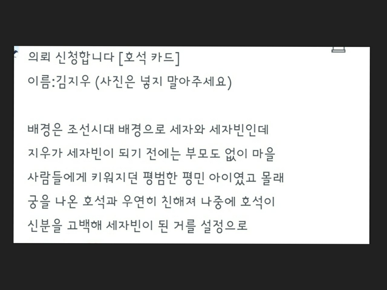 신선한 의뢰가 많아요 ㅎㅎㅎㅎ 사진은 사극이 아니지만, 한복입었다~~생각하고 봐주세요 ㅋㅋㅋㅋㅋ