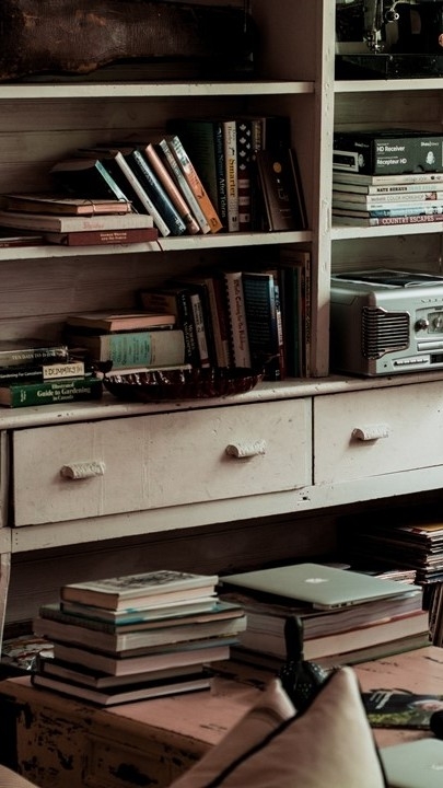 계속 바닥을 보던 그의 시선이 향한 곳은 책들로 가득한 책장,