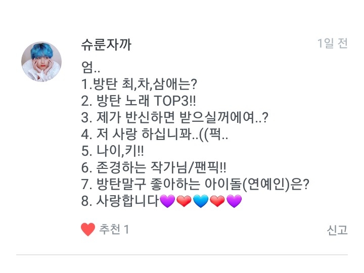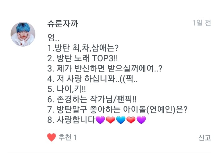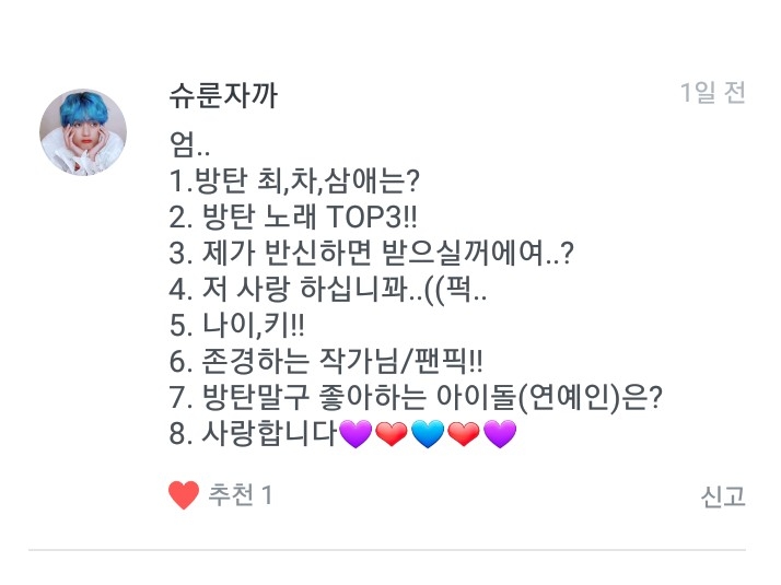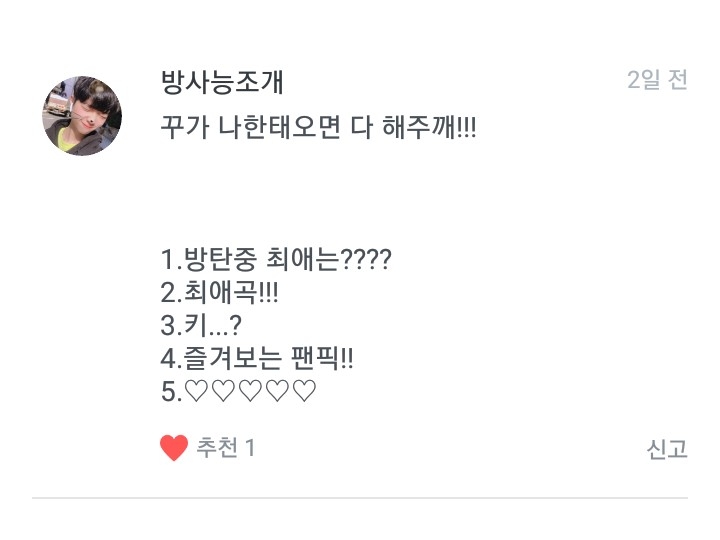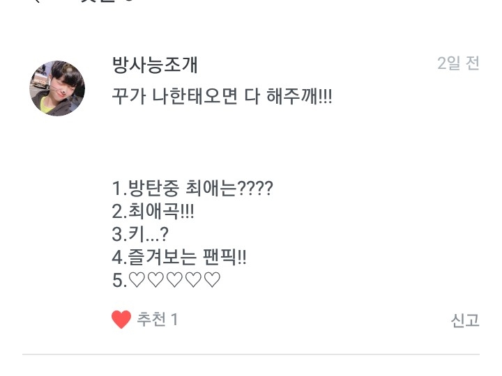 1. 방탄 최애는 저구여 차애는 꾹이구여 삼애는진형이라네여!!! 2. 일단 1위이밤이구여 2위는 SO WHAT 3위는 둘! 셋! (그래도 좋은 날이 더 많기를) 입니다!!