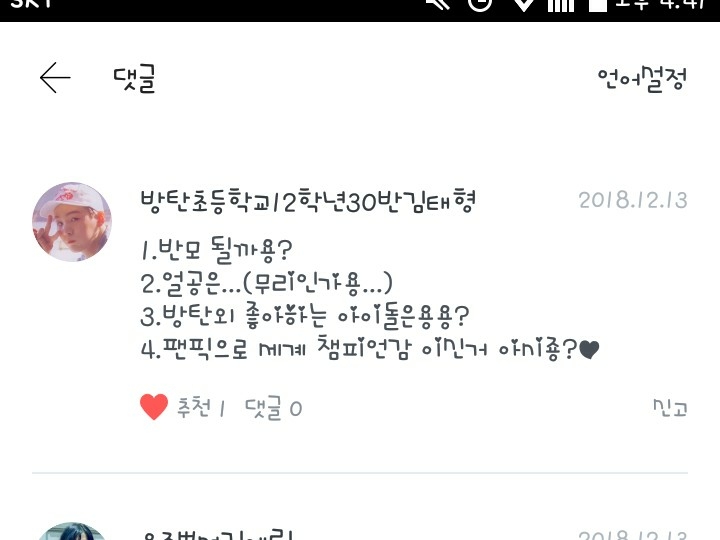 방탄초등학교12학년30반김태형님!