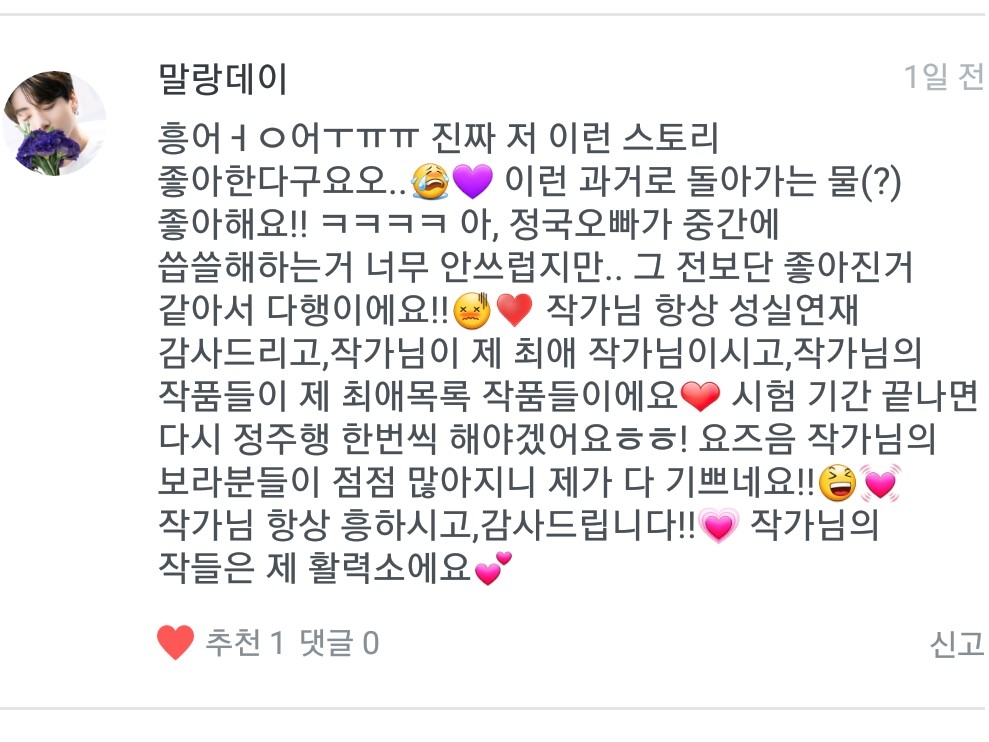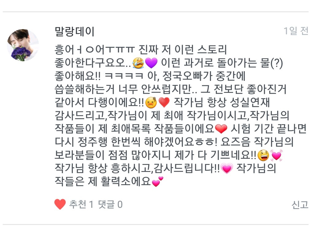 마자요ㅠㅠ 제가 다 안쓰럽다구요ㅠㅠ 제 글을 기다려주시는 보라님들이 눈에 아른거려서 제가 안 쓸수가 있어야지요ㅠㅠ 저랑 제 작들 좋아해주셔서 감사합니다😭 저 정말 많이 부족한데ㅠ 정주행은 사랑이죠🙆♀️💜 보라분들 많아져서 저도 기분이 좋아용💜