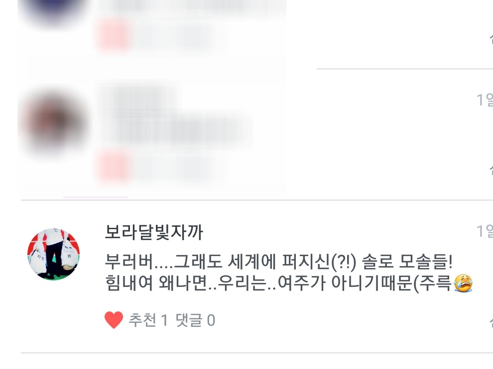 다음은 베스트글💜 아주 맞는 말이여서 베스트로 뽑았습니다😄 저도 모솔이라서 여주가 너무너무 부럽군요 흐규😭 저도 힘을 내야겠습니다 ((주륵