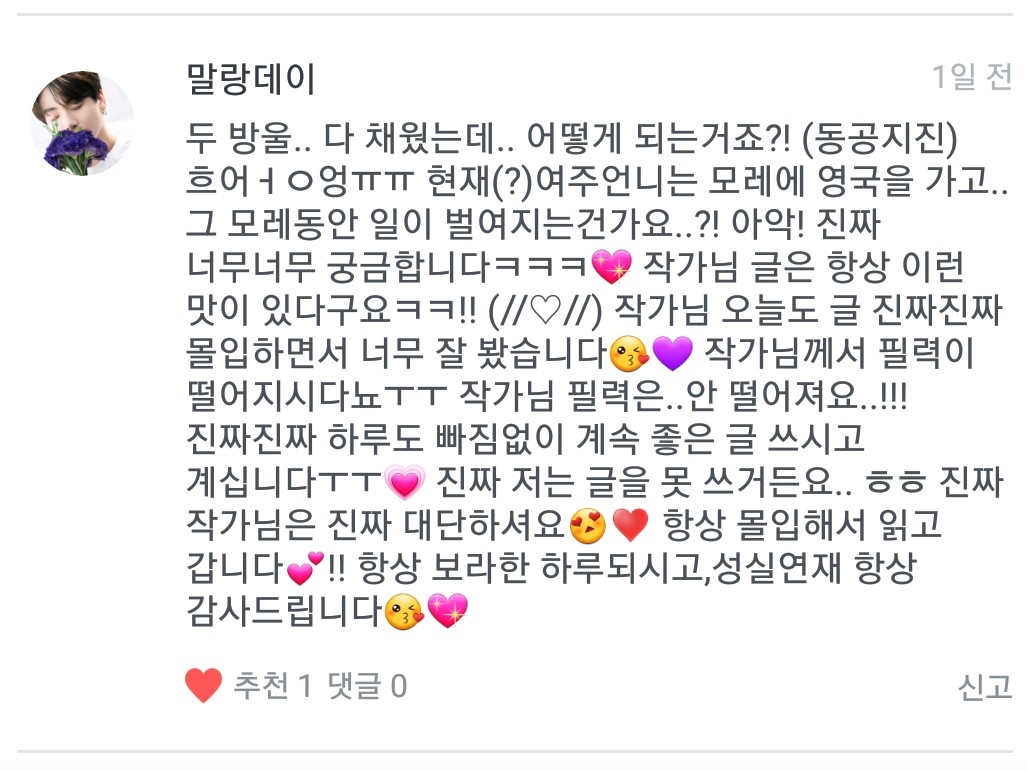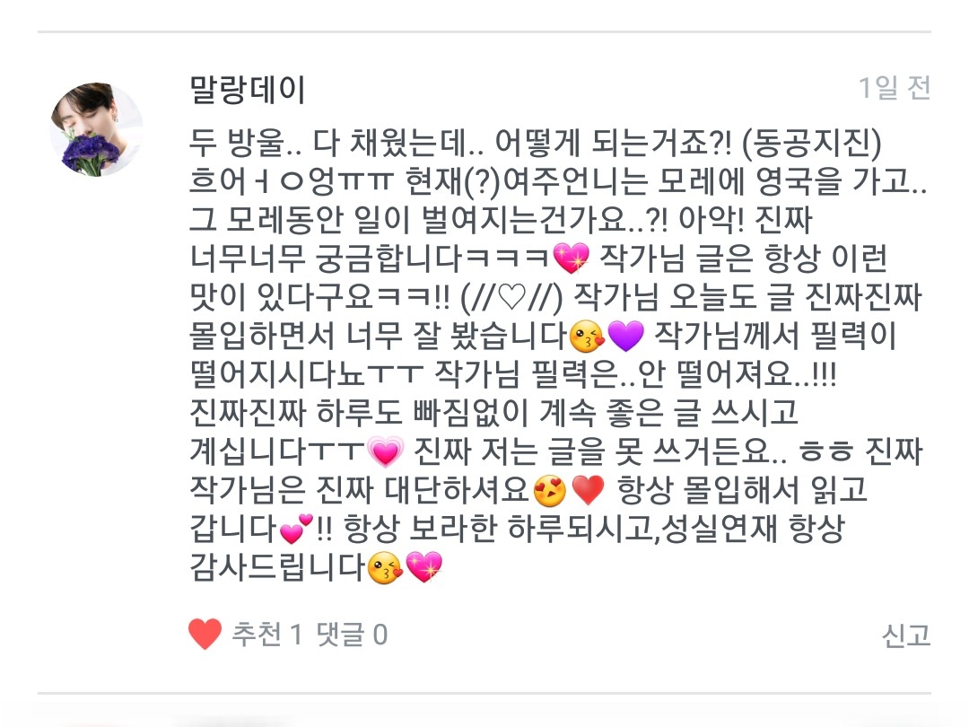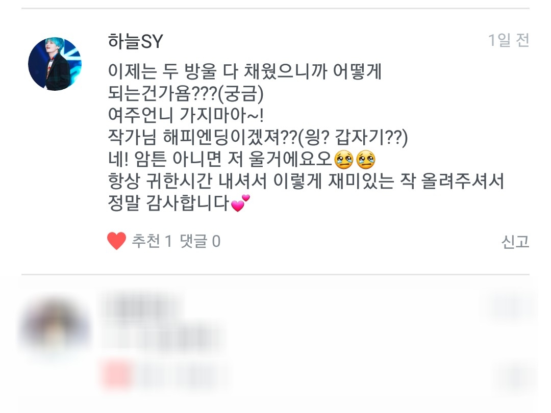 두방울 채웠으니 이제 한방울 더 채워야죠😄 네네 그 모레라는 시간 안에 49일이 끝날겁니다. 그러니 정국오빠가 늦지 않을수도 있단 말이죠... 큼... ((스포는 여기까지)) 저도 궁금해요!!(?)😂 아직 거기까지는 쓰지 않이서 크큼...
