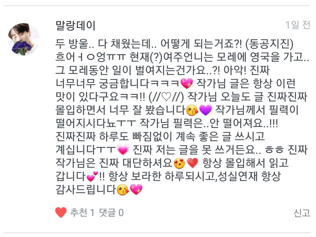 그래도 스토리 생각은 다 해놨어요😄 앞으로의 일이 몰라서 더욱더 궁금하시죠? 저는 이런걸 좋아해서 ㅋㅋ 오늘도 필력 떨어진글 죄송해요ㅠㅠ 그렇게 말해주셔서 감사해요ㅠㅠ😭😭🙆♀️😍💜 아니예요. 울님은 저보다 글 잘 쓰실것 같은데...?
