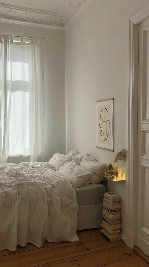 _나풀거리는 반투명한 하얀 커튼을 양옆으로 걷어붙인 후, 침대 위에 널브러진 이불을 개기 시작하지.