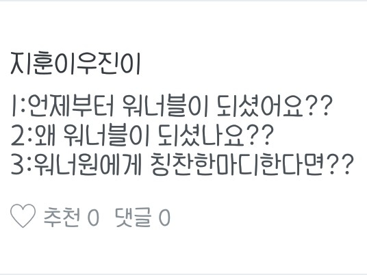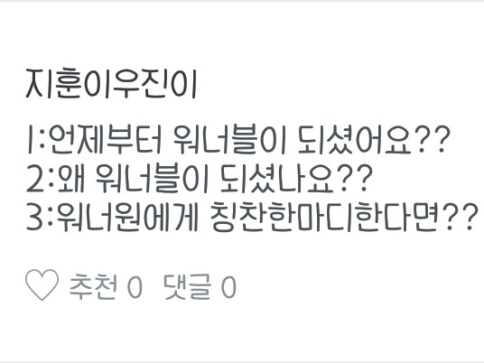 1.언제부터 워너블이 되셨어요?(음.. 말하자면 좀 긴데.. 제가 아는 친한언니랑 얘기를 하고 있었는데 워너원 얘기가 나온거예요 그때는 워너원을 몰라서 얘기를 않하고 있었죠 근데 찾아보니까 너무 잘생기고 실력도 좋아서 워너블이 된거죠)