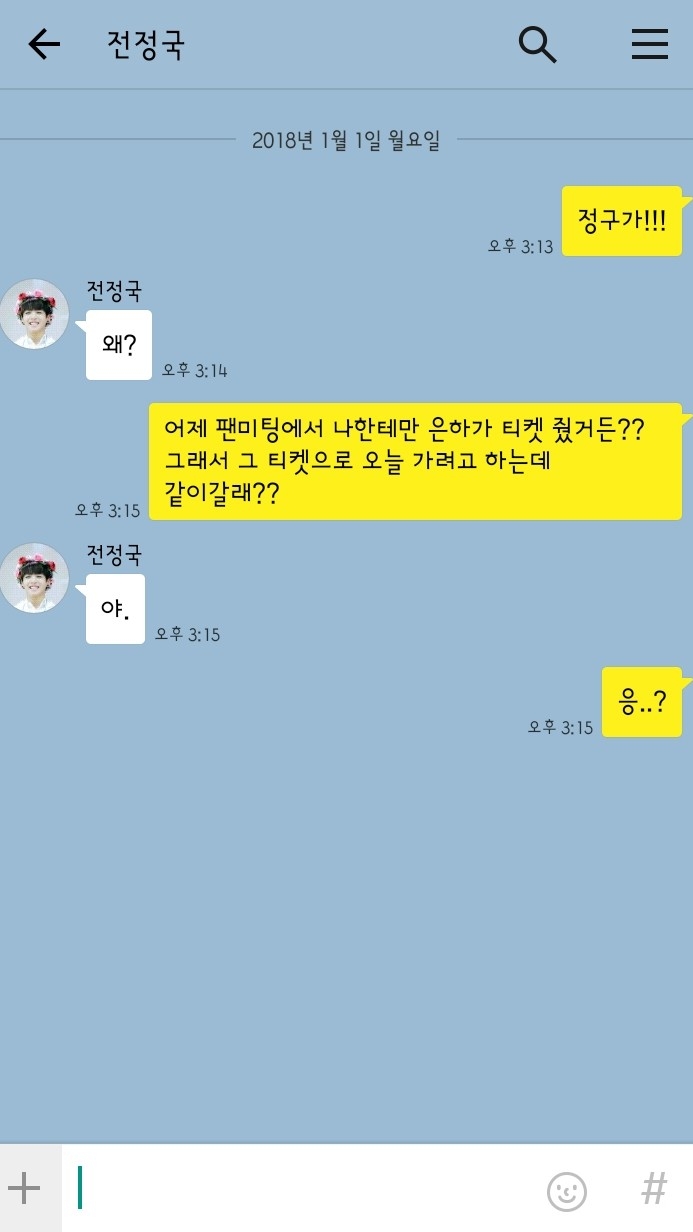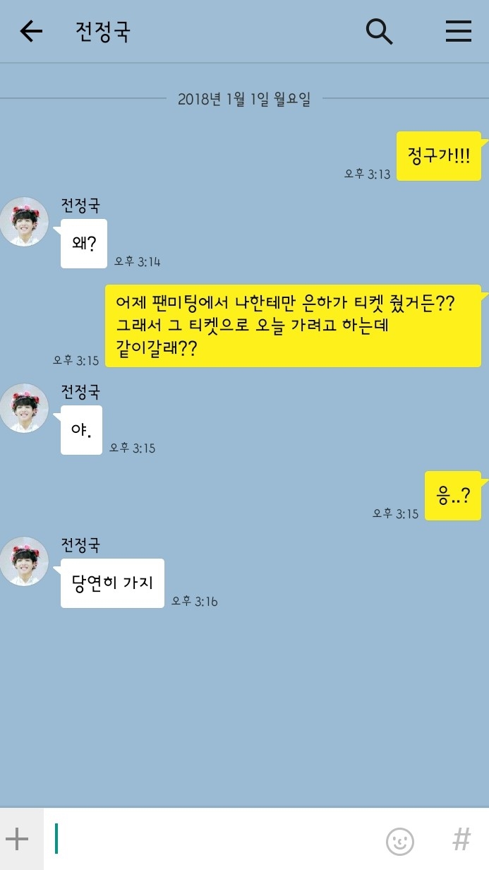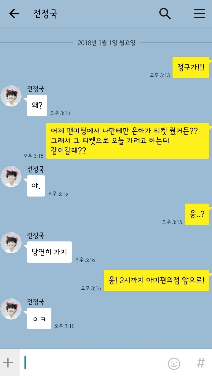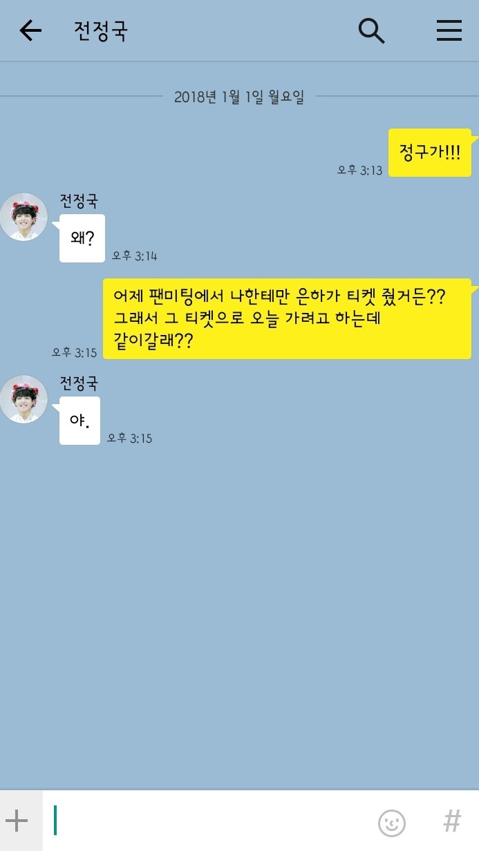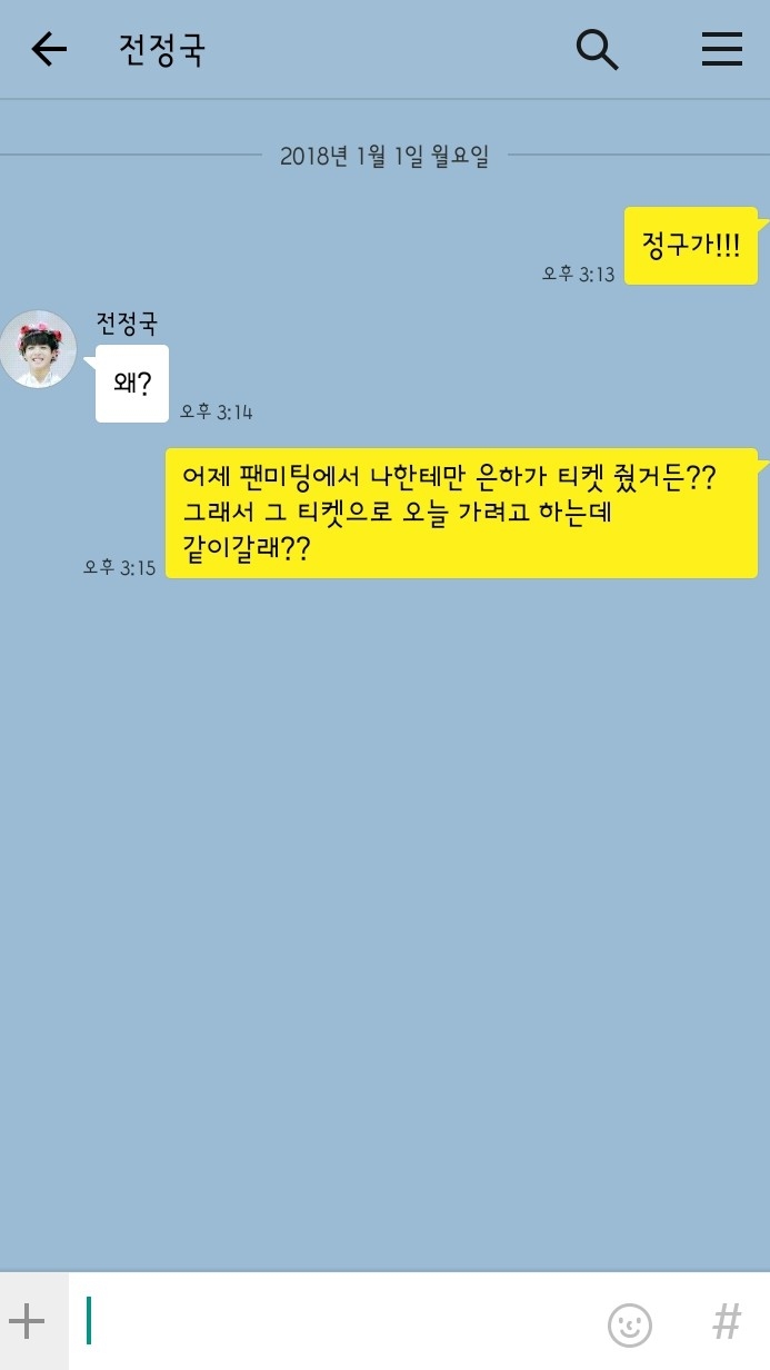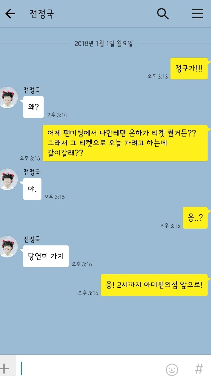 "어제 팬미팅에서 나한테만 은하가 티켓 줬거든?? 그래서 그 티켓으로 오늘 가려고 하는데 같이갈래??"